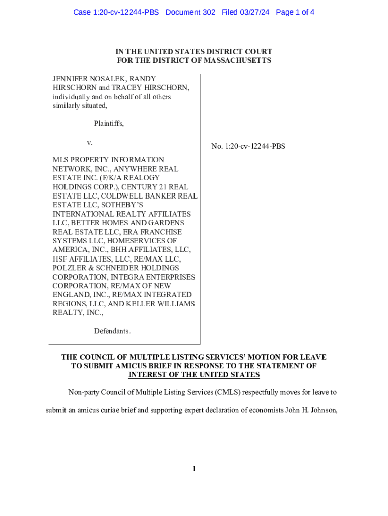 Case 1:20cv12244PBS Document 302 Filed 03/27/24 Page 1 of 4IN THE UNITED STATES DISTRICT COURT FOR THE DISTRICT OF MASSACHUSETTS JENNIFER NOSALEK, RANDY HIRSCHORN and TRACEY HIRSCHORN, individually and on behalf of all others similarly situated, Plaintiffs, v.No. 1:20cv12244PBSMLS PROPERTY INFORMATION NETWORK, INC., ANYWHERE REAL ESTATE INC. (F/K/A REALOGY HOLDINGS CORP.), CENTURY 21 REAL ESTATE LLC, COLDWELL BANKER REAL ESTATE LLC, SOTHEBYS INTERNATIONAL REALTY AFFILIATES LLC, BETTER