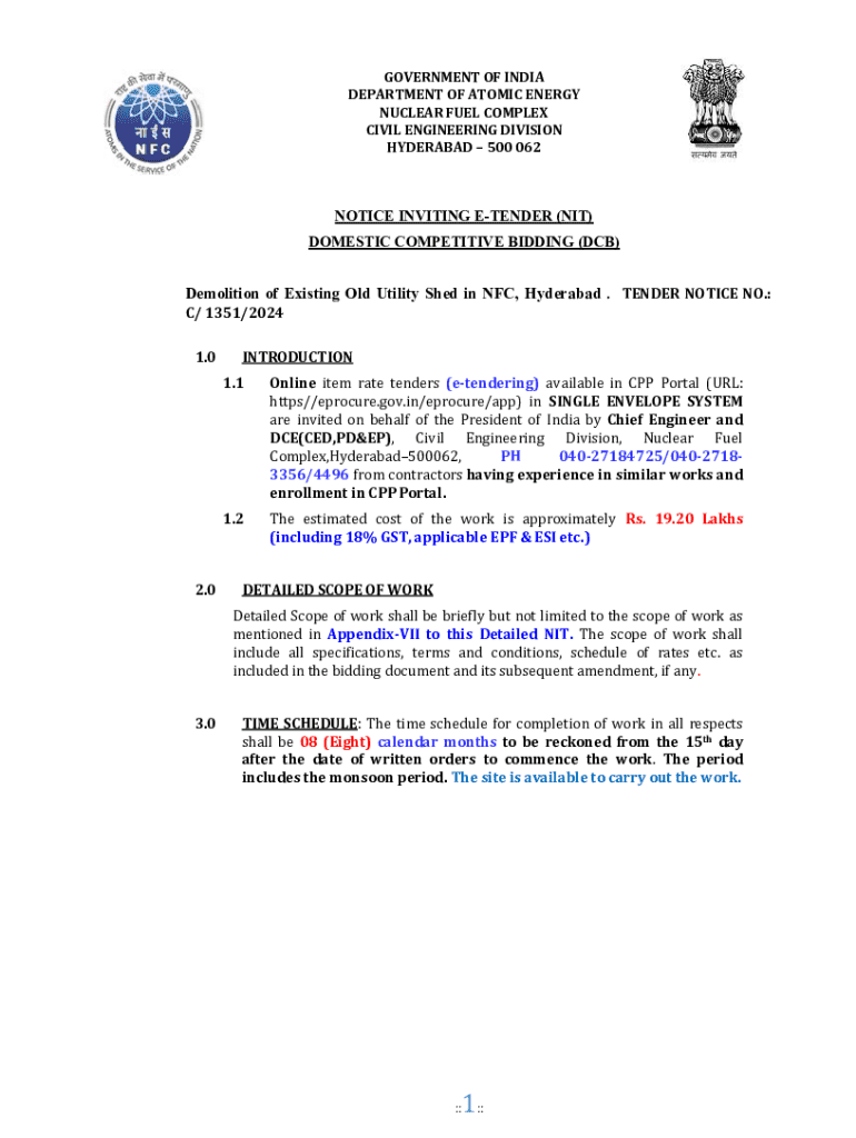 GOVERNMENT OF INDIA DEPARTMENT OF ATOMIC ENERGY NUCLEAR FUEL COMPLEX CIVIL ENGINEERING DIVISION HYDERABAD 500 062NOTICE INVITING ETENDER (NIT) DOMESTIC COMPETITIVE BIDDING (DCB)Demolition of Existing