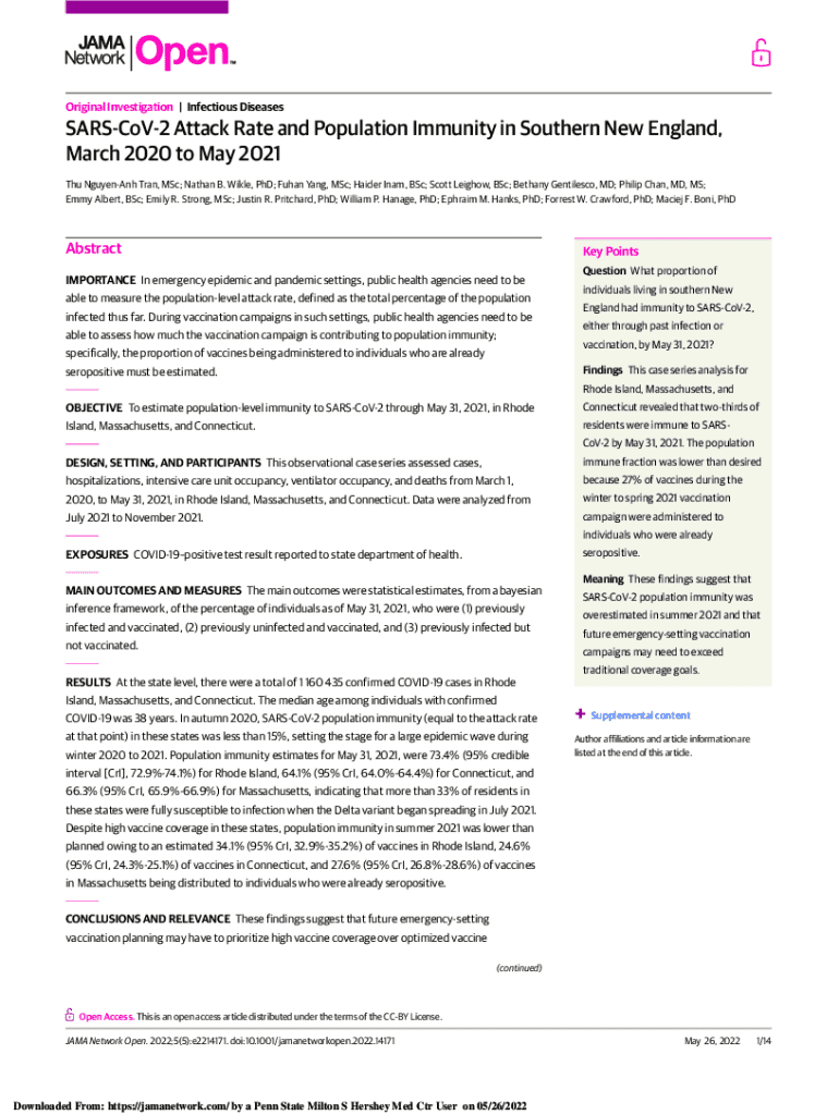 Original Investigation | Infectious DiseasesSARSCoV2 Attack Rate and Population Immunity in Southern New England, March 2020 to May 2021 Thu NguyenAnh Tran, MSc; Nathan B. Wikle, PhD; Fuhan Yang, MSc; Haider Inam, BSc; Scott Leighow, BSc; Bethany Gentilesco, MD; Philip Chan, MD, MS; Emmy Albert, BSc; Emily R. Strong, MSc; Justin R. Pritchard, PhD; William P. Hanage, PhD; Ephraim M. Hanks, PhD; Forrest W. Crawford, PhD; Maciej F. Boni, PhDAbstractKey PointsIMPORTANCE In emergency epidemic