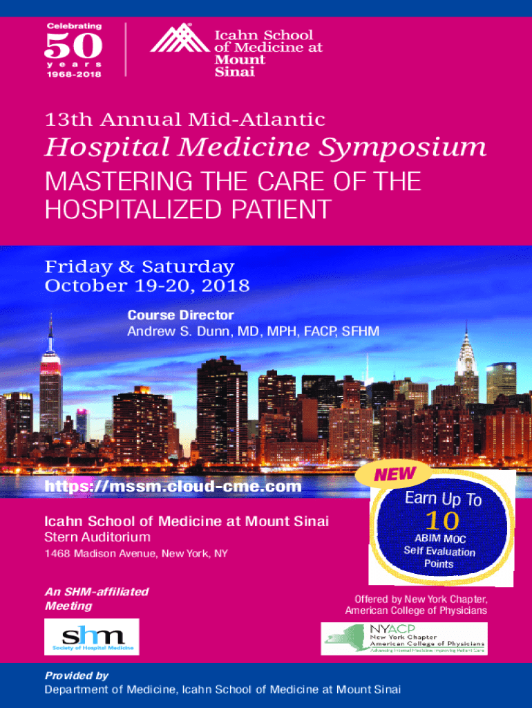 Join the 13th Annual Mid-Atlantic Hospital Medicine Symposium to enhance your skills in hospital care. Earn up to 10 MOC points while learning from top experts in October 2018.