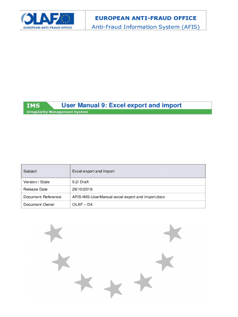 EUROPEAN ANTIFRAUD OFFICE AntiFraud Information System (AFIS)User Manual 9: Excel export and importSubjectExcel export and importVersion / State0.2/ DraftRelease Date26/10/2018Document ReferenceAFISIMSUserManualexcel export and import.docxDocument OwnerOLAF D4User Manual Document Identification Name, FunctionDateWritten byBen Van Der Fels (OLAF D2)03/10/2016Updated byBen Van Der Fels (OLAF D2)15/10/2018Checked byBen Van Der Fels (OLAF D2)15/10/2018Approved