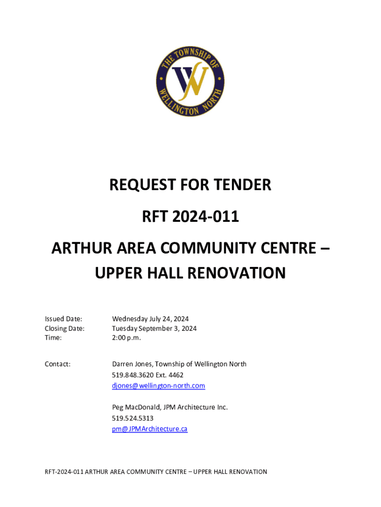 REQUEST FOR TENDER RFT 2024011 ARTHUR AREA COMMUNITY CENTRE UPPER HALL RENOVATION Issued Date: Closing Date: Time:Wednesday July 24, 2024 Tuesday September 3, 2024 2:00 p.m.Contact:Darren Jones, Township of Wellington North 519.848.3620 Ext. 4462 djones@wellingtonnorth.com Peg MacDonald, JPM Architecture Inc. 519.524.5313 pm@JPMArchitecture.caRFT2024011 ARTHUR AREA COMMUNITY CENTRE UPPER HALL RENOVATIONTable of Contents SECTION 1: Information to Bidders ...................