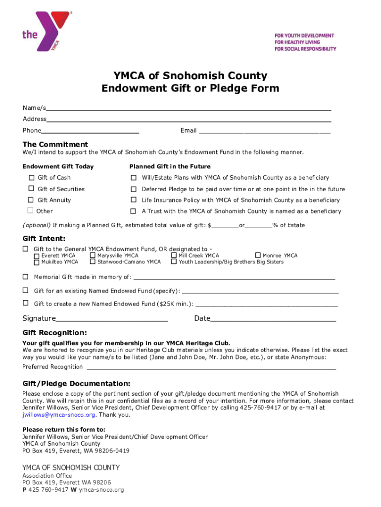 Get the free YMCA of Snohomish County Endowment Gift or Pledge Form