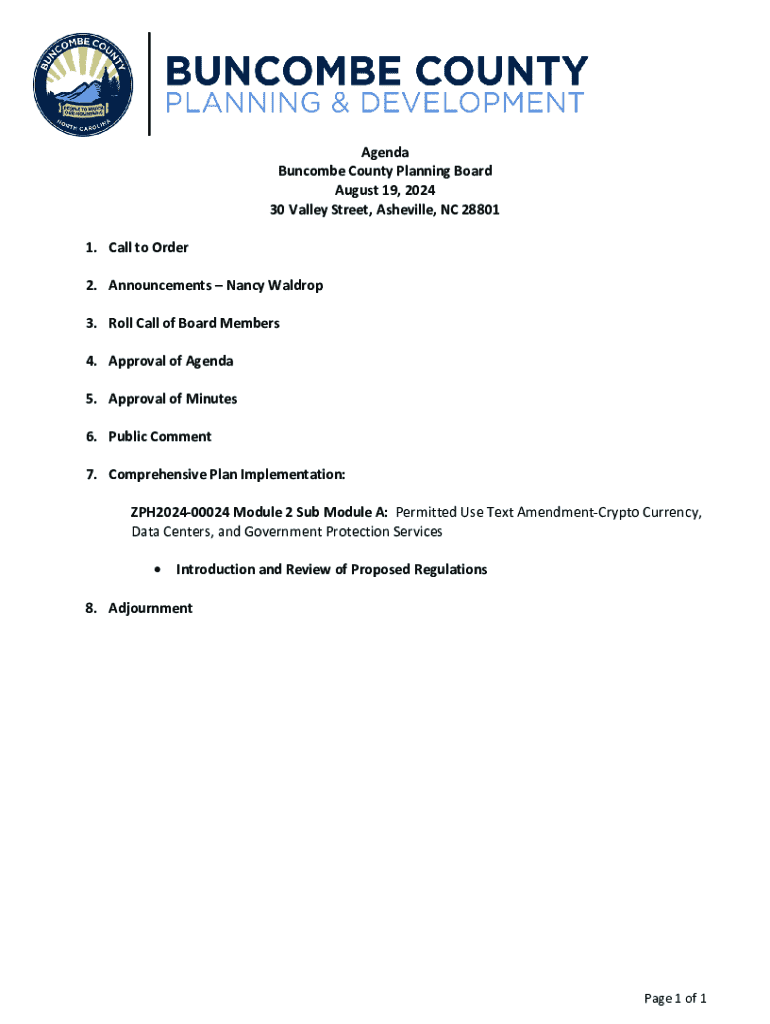CAgenda Buncombe County Planning Board August 19, 2024 30 Valley Street, Asheville, NC 28801 1. Call to Order 2. Announcements Nancy Waldrop 3. Roll Call of Board Members 4. Approval of Agenda 5.