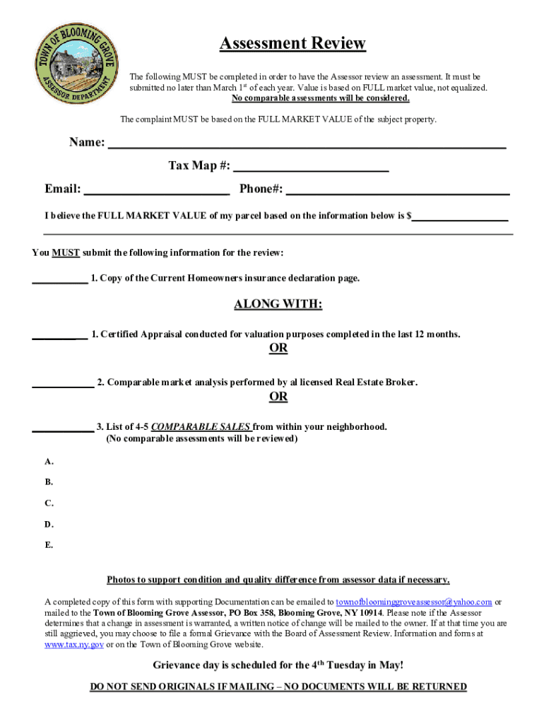 Property owners or their designated agents who disagree with the assessed value of their property are required to file an assessment review form.