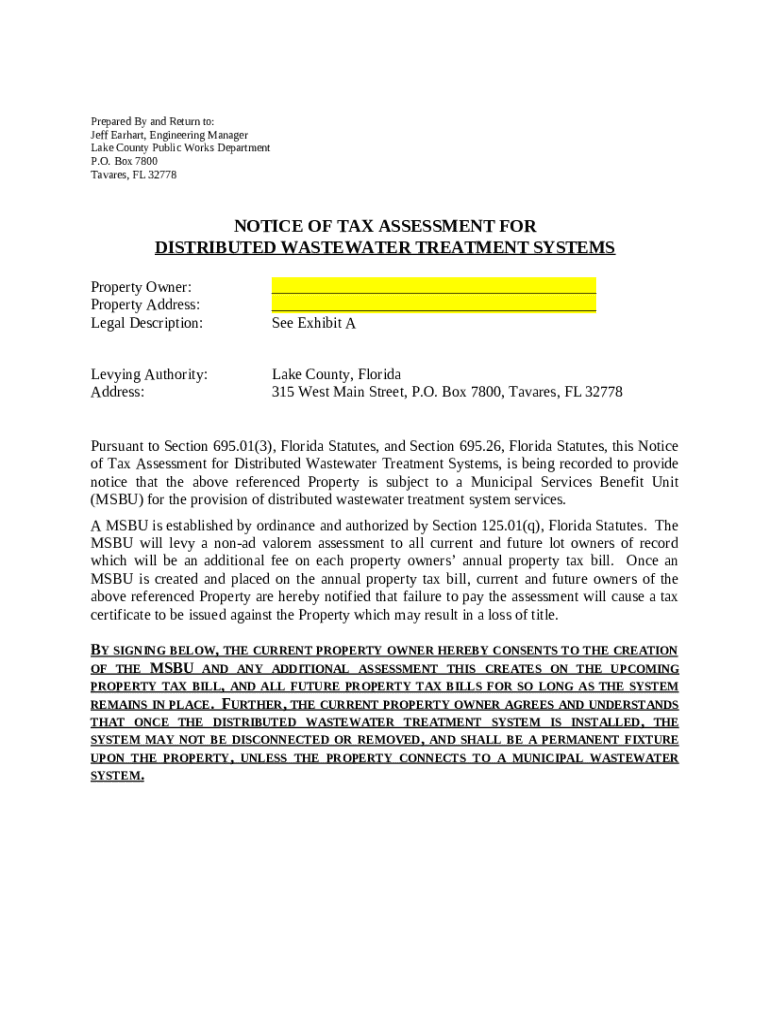 Notice of Tax Assessment for Distributed Wastewater Treatment Systems template instructions