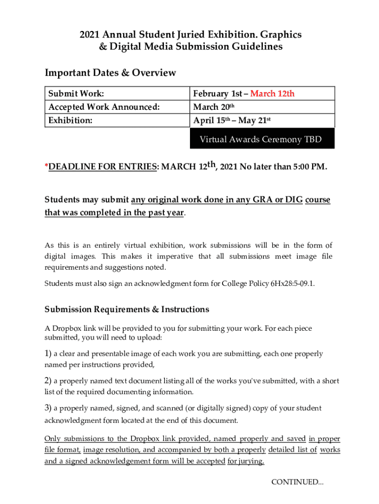 2021 Annual Student Buried Exhibition. Graphics & Digital Media Submission Guidelines Important Dates & Overview Submit Work:February 1st March 12thAccepted Work Announced:March 20thExhibition:April
