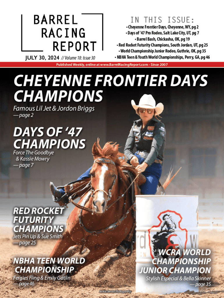IN THIS ISSUE:JULY 30, 2024 // Volume 18: Issue 30 Cheyenne Frontier Days, Cheyenne, WY, pg 2 Days of 47 Pro Rodeo, Salt Lake City, UT, pg 7 Barrel Bash, Chickasha, OK, pg 19 Red Rocket Futurity Champions, South Jordan, UT, pg 25 World Championship Junior Rodeo, Guthrie, OK, pg 35 NBHA Teen & Youth World Championships, Perry, GA, pg 46Published Weekly, online at www.BarrelRacingReport.com Since 2007CHEYENNE FRONTIER DAYS CHAMPIONSFamous Lil Jet & Jordon Briggs