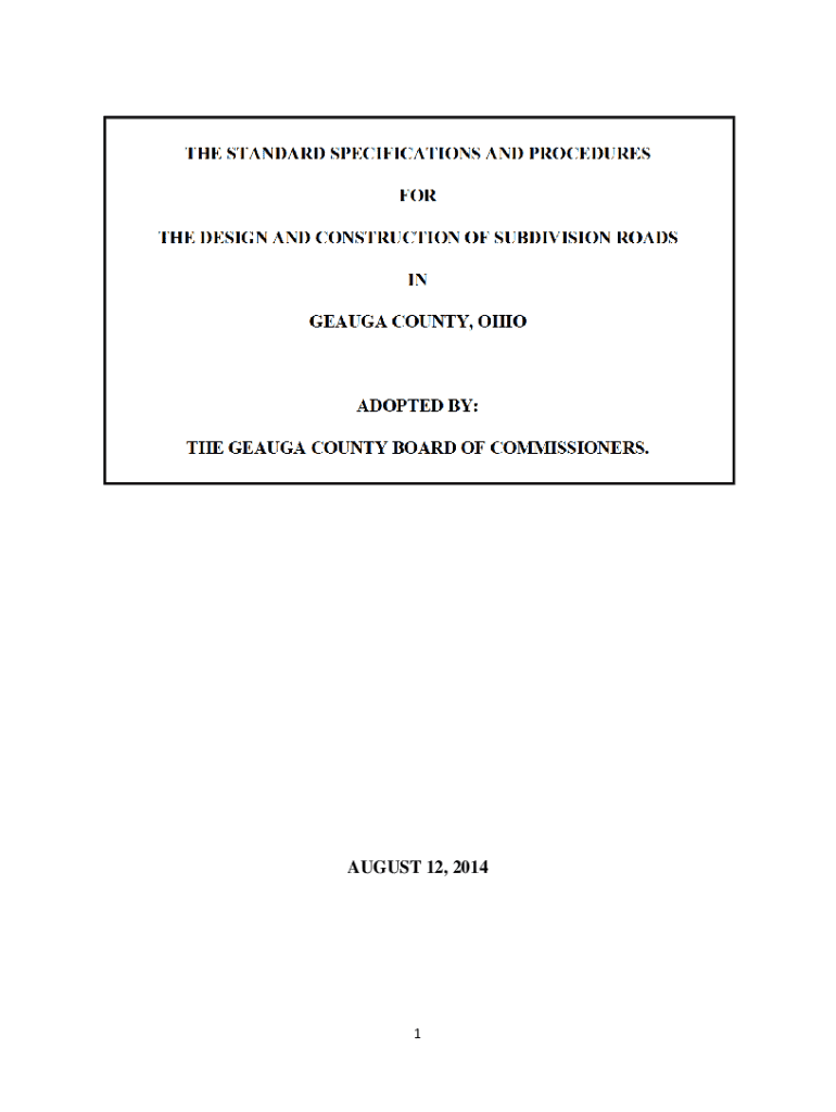 THE STANDARD SPECIFICATIONS AND PROCEDURES FOR THE DESIGN AND CONSTRUCTION OF SUBDIVISION ROADS IN GEAUGA COUNTY, OHIOADOPTED BY: THE GEAUGA COUNTY BOARD OF COMMISSIONERS.AUGUST 12, 201412TABLE OF