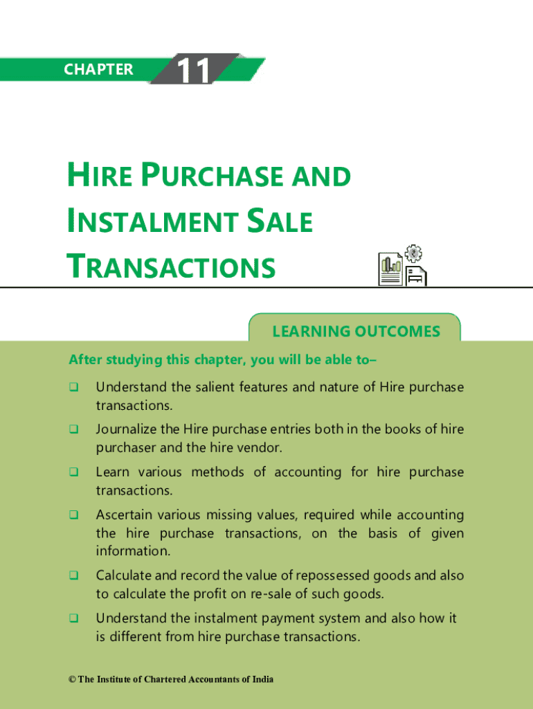 CHAPTER11HIRE PURCHASE AND INSTALMENT SALE TRANSACTIONS LEARNING OUTCOMES After studying this chapter, you will be able to Understand the salient features and nature of Hire purchase transactions. Journalize the Hire purchase entries both in the books of hire purchaser and the hire vendor. Learn various methods of accounting for hire purchase transactions. Ascertain various missing values, required while accounting the hire purchase transactions, on the basis of given information