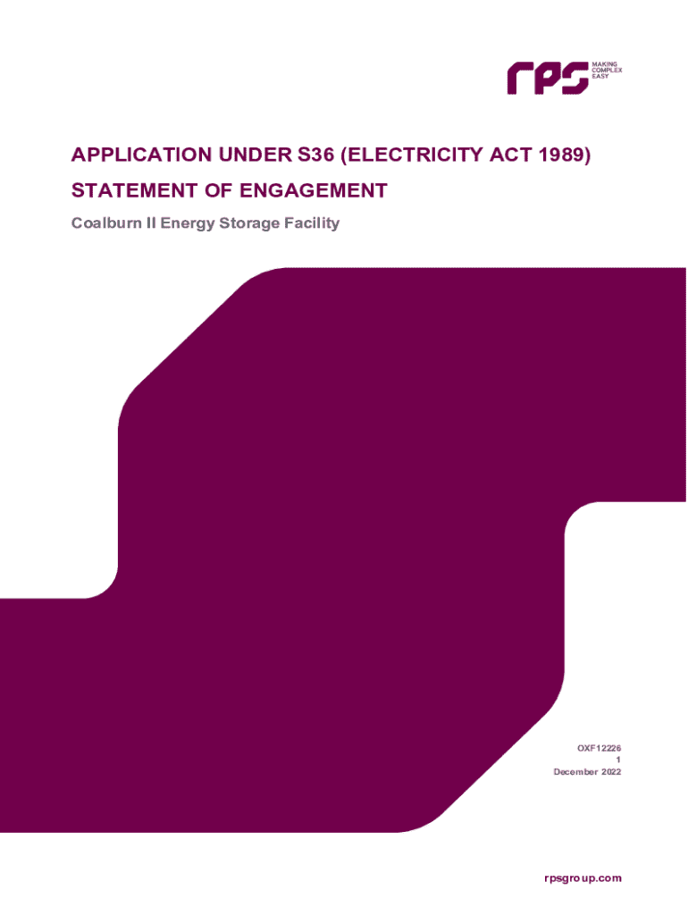APPLICATION UNDER S36 (ELECTRICITY ACT 1989) STATEMENT OF ENGAGEMENT Coalburn II Energy Storage FacilityOXF12226 1 December 2022rpsgroup.comREPORT Document status VersionPurpose of documentAuthored byReviewed byApproved byReview date1SubmissionKCPWJS07/12/22Approval for issue Jonathan Smith2022The report has been prepared for the exclusive use and benefit of our client and solely for the purpose for which it is provided. Unless otherwise agreed in writing by RPS