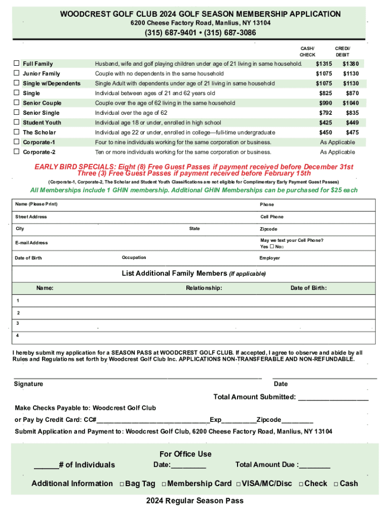 Apply for the 2024 Season Pass at Woodcrest Golf Club. Explore various membership classifications and enjoy exclusive early bird specials!