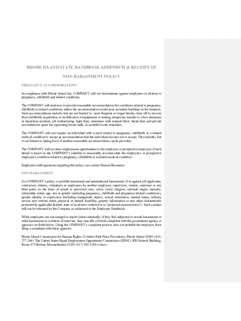 RHODE ISLAND STATE HANDBOOK ADDENDUM & RECEIPT OF HARASSMENT POLICY PREGNANCY ACCOMMODATIONS In compliance with Rhode Island law, COMPANY will not discriminate against employees in relation to pregnancy,