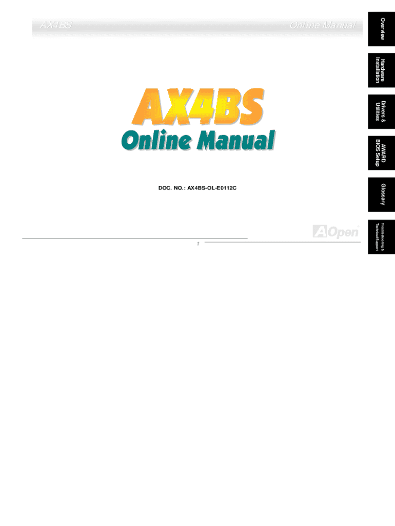 Hardware InstallationAX4BSDrivers & UtilitiesAWARD BIOS SetupGlossaryDOC. NO.: AX4BSOLE0112CTechnical SupportTroubleshooting &1OverviewOnline Manual AX4BS AX4BS Online Manual ................................................................................................................................................. 1 Whats in this manual .......................................................................................