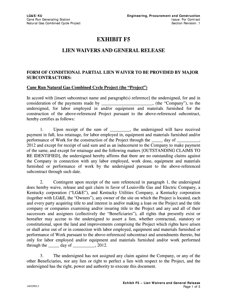 LGGE/KU Cane Run Generating Station Natural Gas Combined Cycle Project Engineering, Procurement and Construction Issue: For Contract Section Revision: 1 EXHIBIT F5 LIEN WAIVERS AND GENERAL RELEASE