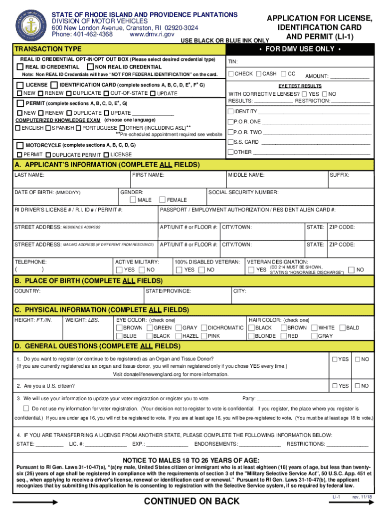 Complete the LI-1 application to obtain a Rhode Island driver\'s license or identification card. Ensure all required documents are submitted for processing.