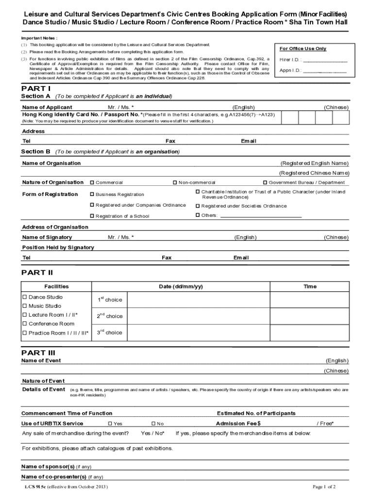 Apply for booking minor facilities at SHA Tin Town Hall. Fill out the Civic Centers Booking Application Form for events like dance, music, and more.