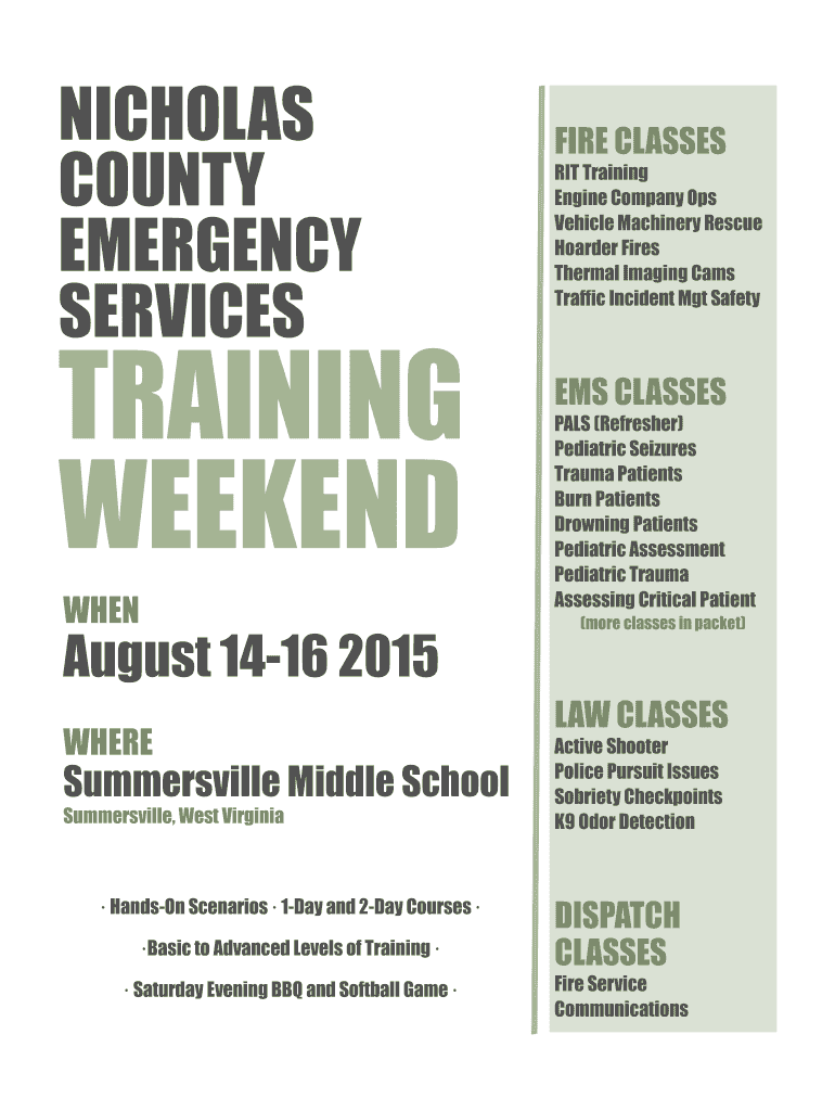 NICHOLAS COUNTY EMERGENCY SERVICES TRAINING WEEKEND WHEN August 1416 2015 WHERE Summerville Middle School Summerville, West Virginia Hanson Scenarios 1Day and 2Day Courses Basic to Advanced Levels