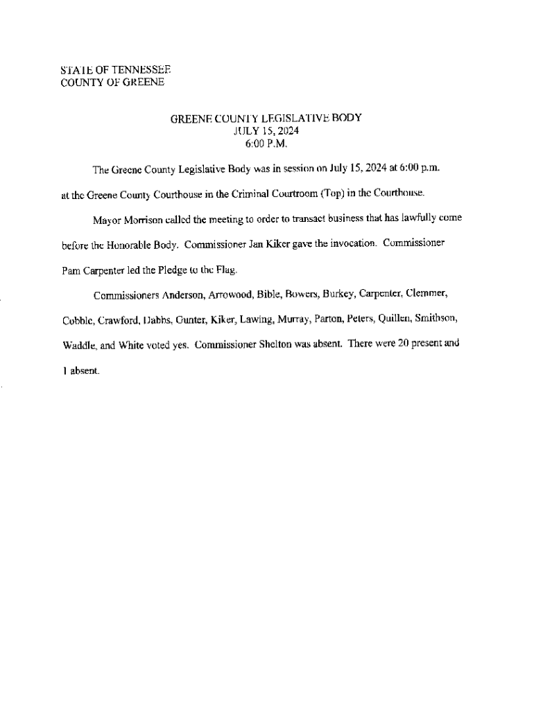 STATE OF TENNESSEE COUNTY OF GREENEGREENE COUNTY LEGISLATIVE BODY JULY 15, 2024 6:00 P.M. The Greene County Legislative Body was in session on July 15, 2024 at 6:00 p.m. at the Greene County Courthouse in the Criminal Courtroom (Top) in the Courthouse. Mayor Morrison called the meeting to order to transact business that has lawfully come before the Honorable Body. Commissioner Jan Kiker gave the invocation. Commissioner Pam Carpenter led the Pledge to the Flag. Commissioners Anderson, Arrowood,