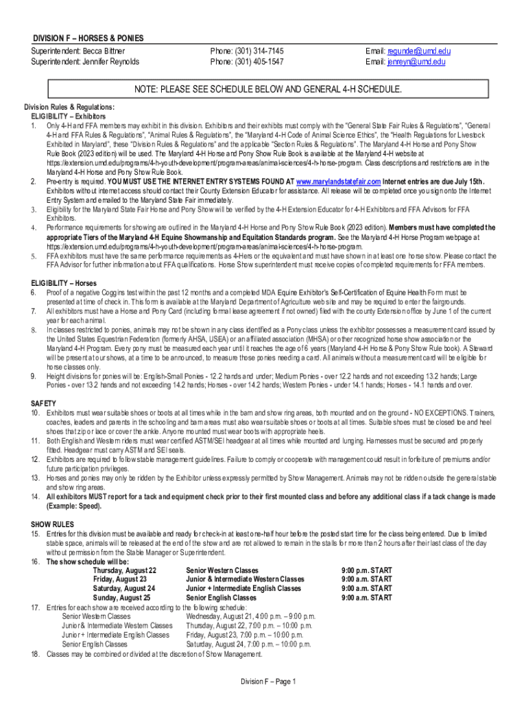 Explore the 2023 Division F rules for horses and ponies in the Maryland 4-H Show. Details on eligibility, performance classes, and horse show guidelines.