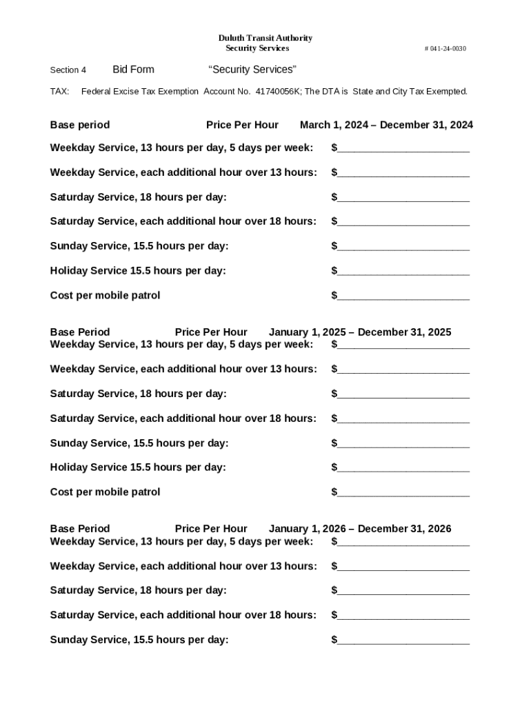 The Bid for Security Services is a fillable form in MS Word extension needed to be submitted to the specific address in order to provide certain information. It must be completed and signed, which can be done in hard copy, or with the help of a particular solution like PDFfiller. It lets you complete any PDF or Word document directly in your browser, customize it depending on your needs and put a legally-binding e-signature. Right away after completion, the user can easily send the Bid for Security Services to the relevant recipient, or multiple ones via email or fax. The editable template is printable as well from PDFfiller feature and options offered for printing out adjustment. Both in digital and physical appearance, your form should have a clean and professional appearance. You can also turn it into a template to use later, so you don't need to create a new file from scratch. You need just to edit the ready form.