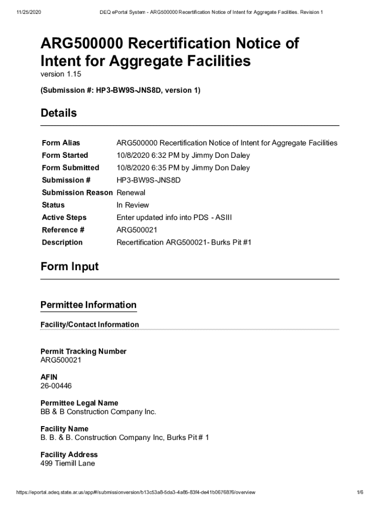 Get the free Arg500000 Recertification Notice of Intent for Aggregate Facilities