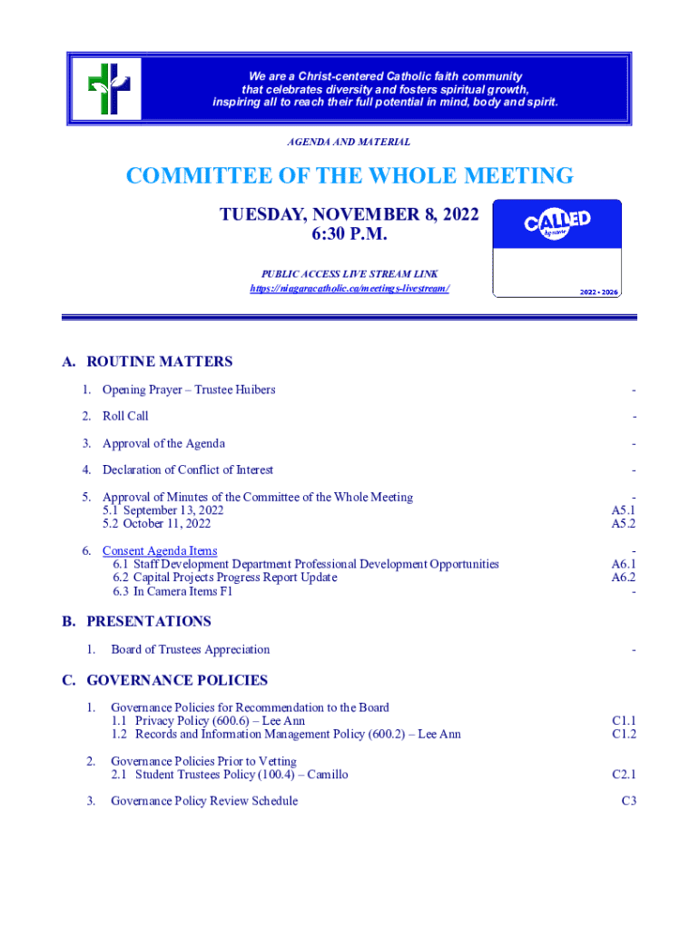 We are a Christcentered Catholic faith community that celebrates diversity and fosters spiritual growth, inspiring all to reach their full potential in mind, body and spirit. AGENDA AND MATERIALCOMMITTEE