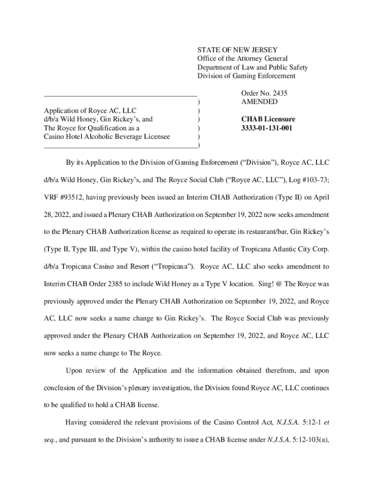 STATE OF NEW JERSEY Office of the Attorney General Department of Law and Public Safety Division of Gaming Enforcement ___ ) Application of Royce AC, LLC ) d/b/a Wild Honey, Gin Rickeys, and ) The