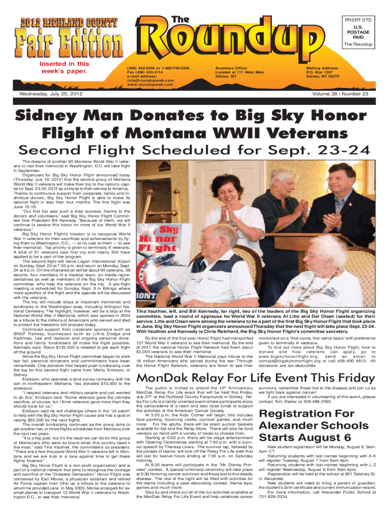 PRSRT STD U.S. POSTAGE PAID The RoundupInserted in this weeks paper.(406) 4333306 or 18007493306 Fax (406) 4334114 email address: info@roundupweb.com www.roundupweb.comBusiness Office: Located at 111 West Main Sidney, MTWednesday, July 25, 2012Mailing Address: P.O. Box 1207 Sidney, MT 59270Volume 38 Number 23Sidney Man Donates to Big Sky Honor Flight of Montana WWII Veterans Second Flight Scheduled for Sept. 2324 The dreams of another 90 Montana World War II veterans to visit their memorial...