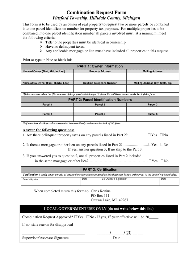 Combination Request Form Pitts ford Township, Hillsdale County, Michigan This form is to be used by an owner of real property to request two or more parcels be combined into one parcel identification