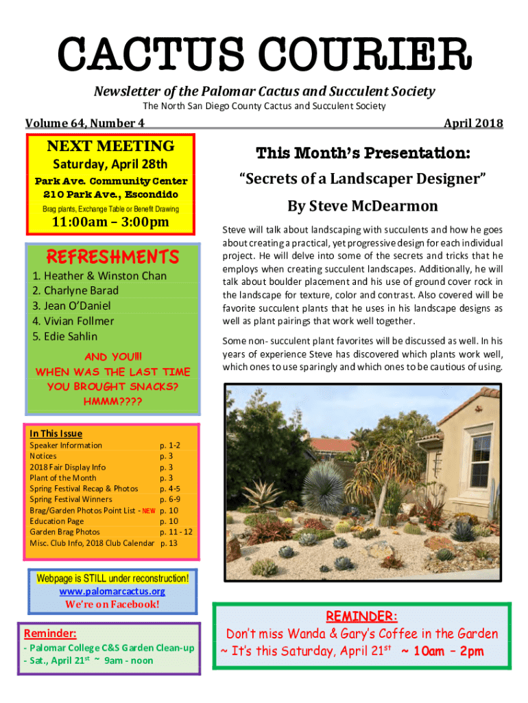 The North San Diego County Cactus and Succulent SocietyVolume 64, Number 4April 2018NEXT MEETING