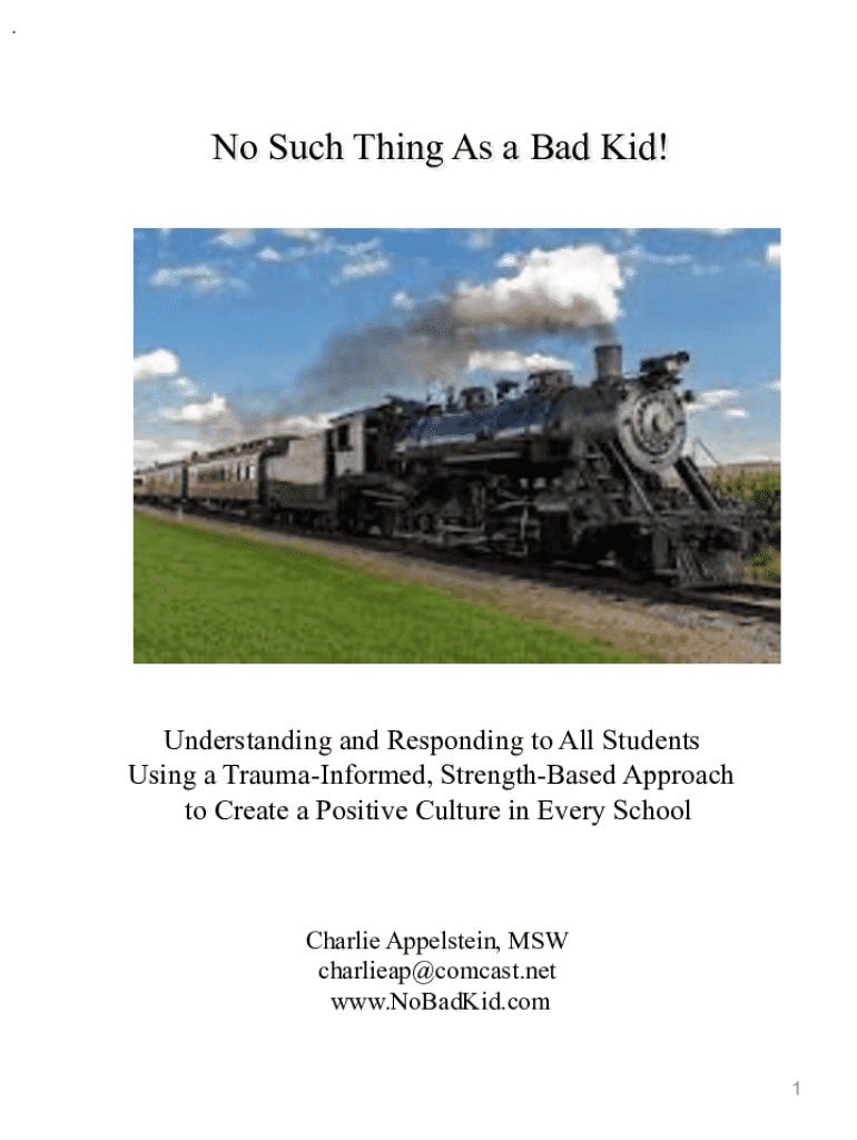 .No Such Thing As a Bad Kid!Understanding and Responding to All Students Using a TraumaInformed, StrengthBased Approach to Create a Positive Culture in Every SchoolCharlie Appelstein, MSW charlieap@comcast.net www.NoBadKid.com 1Scavenger Hunt Find a person who fits the description below. You must get 10 different signatures. 1.Has worked in construction (full or parttime) or is related to a contractor:___ 2.Went on an exotic vacation in the past year (where?): ___3.Has eaten a banana split...