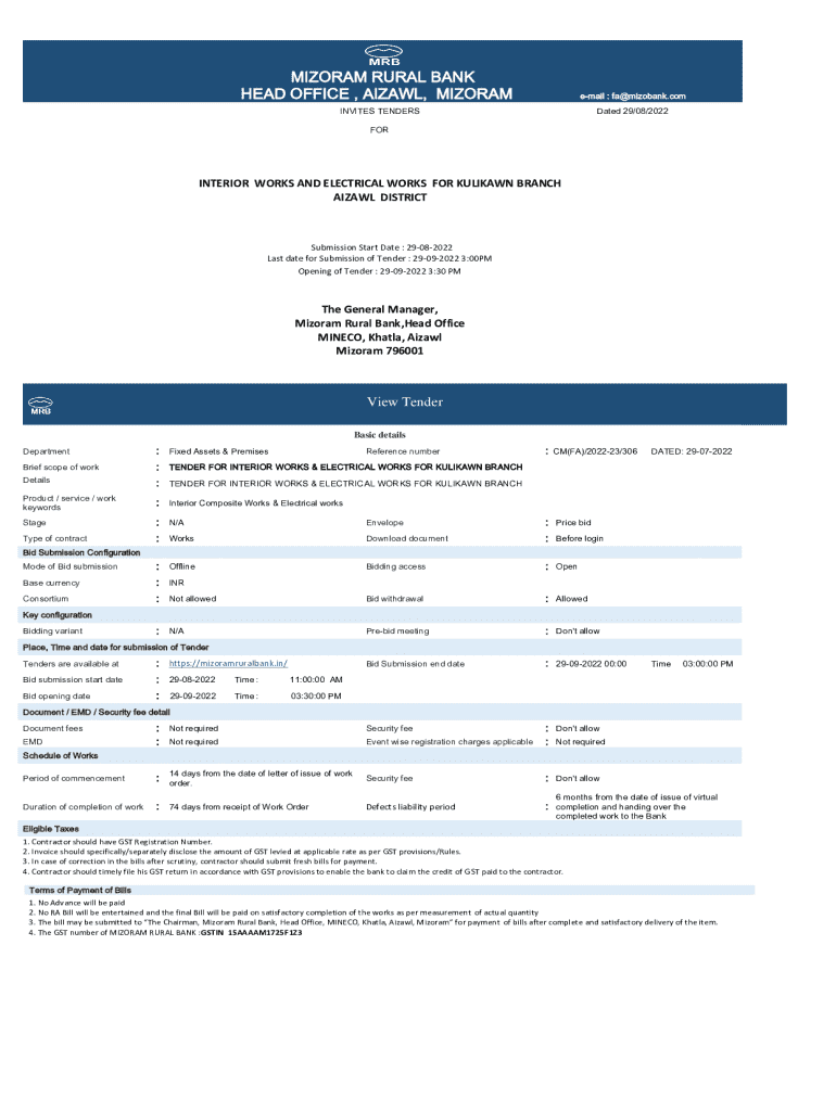 Mizoram Rural Bank invites tenders for interior and electrical works at Kulikawn Branch, Aizawl District. Submission starts on 29-08-2022 and ends on 29-09-2022.
