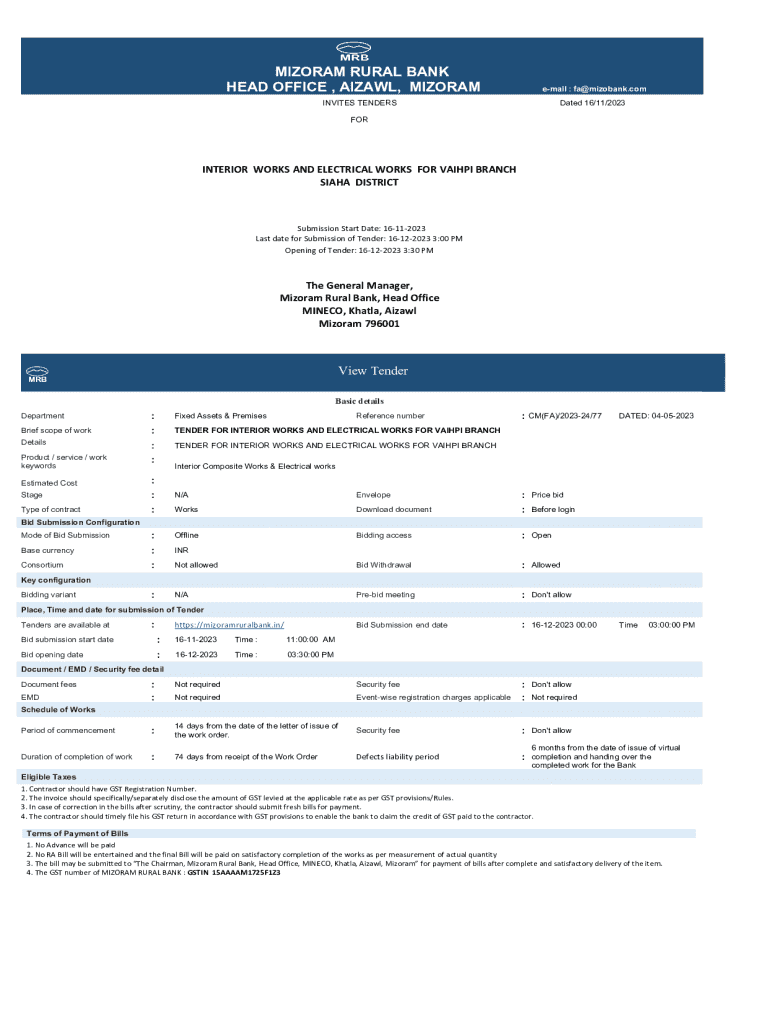 HEAD OFFICE, RIZAL, MIZORAMemail : fa@mizobank.comINVITES Understated 16/11/2023FORINTERIOR WORKS AND ELECTRICAL WORKS FOR VASHTI BRANCH