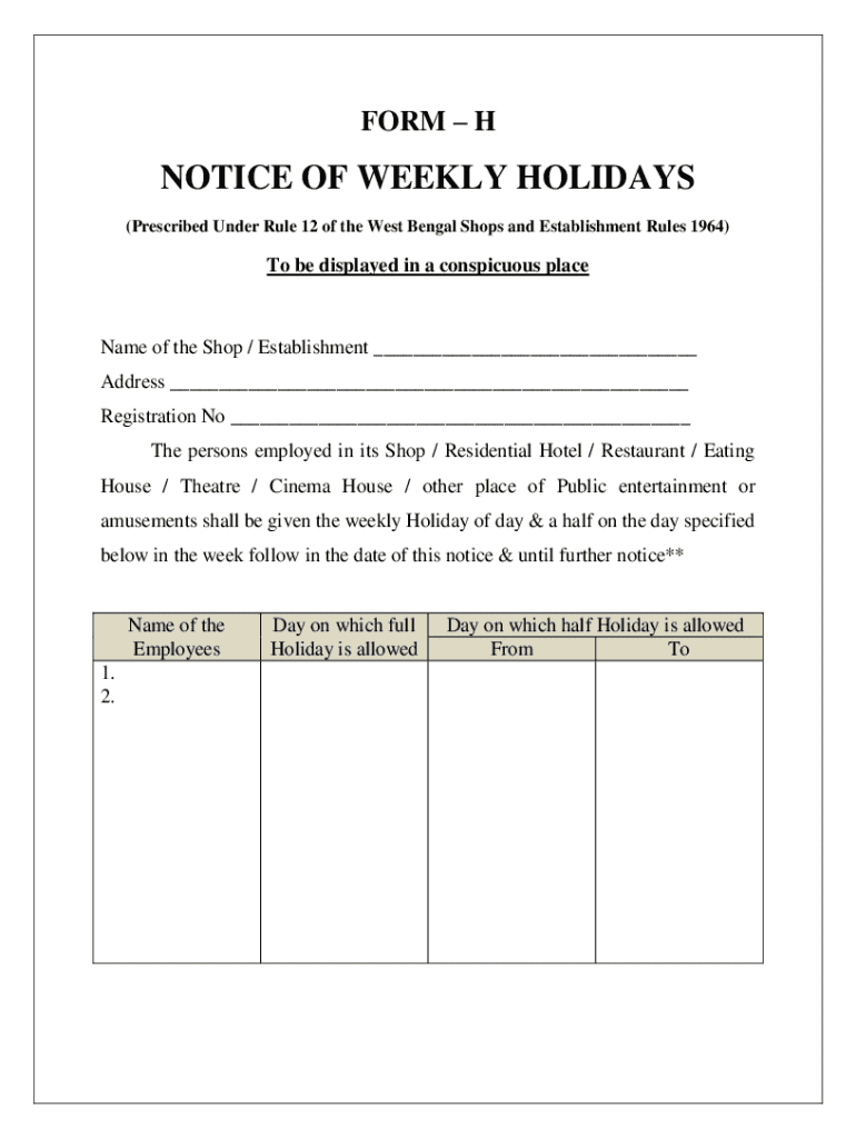 This document provides the official notice for weekly holidays as per West Bengal Shops and Establishment Rules 1964, ensuring compliance for various establishments.