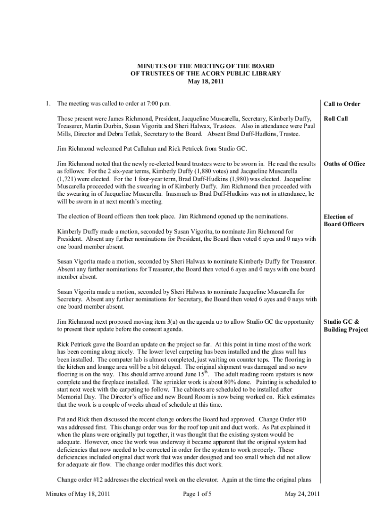 May 18, 20111. The meeting was called to order at 7:00 p.m. Call to OrderThose present were James Richmond, President, Jacqueline