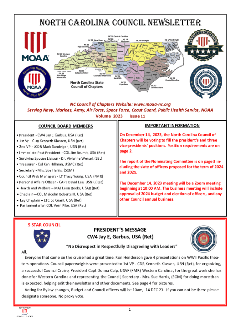 Explore the December 2023 issue of the North Carolina Council Newsletter, featuring updates on council elections, budget approvals, and key member activities.