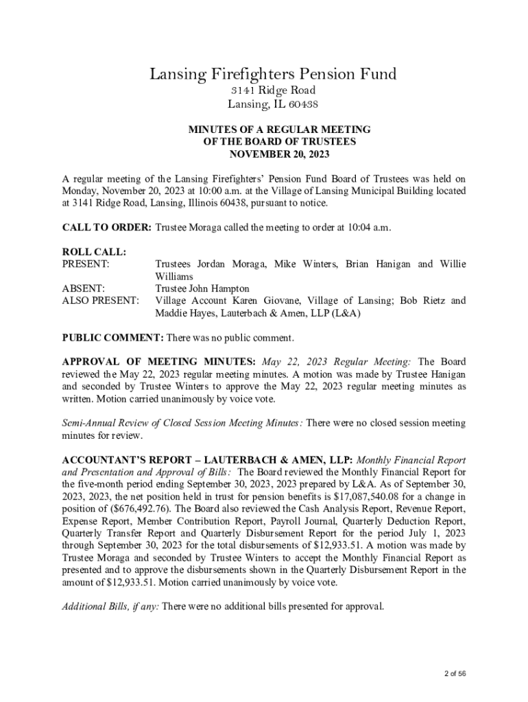 Lansing Firefighters Pension Fund 3141 Ridge Road Lansing, IL 60438MINUTES OF A REGULAR MEETING OF THE BOARD OF TRUSTEES NOVEMBER 20, 2023 A regular meeting of the Lansing Firefighters Pension Fund