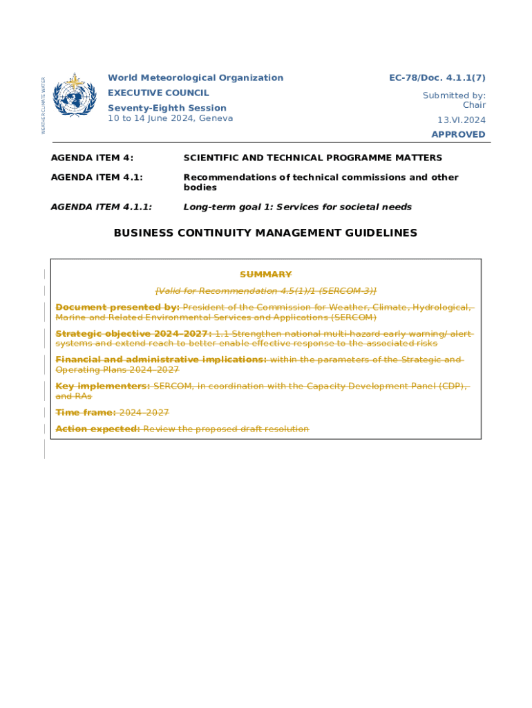 The Nine resolutions on WMO Earth system observation and ... is a fillable form in MS Word extension that should be submitted to the relevant address in order to provide some info. It must be filled-out and signed, which can be done in hard copy, or with a particular software e. g. PDFfiller. This tool allows to complete any PDF or Word document directly in your browser, customize it according to your needs and put a legally-binding e-signature. Right away after completion, you can easily send the Nine resolutions on WMO Earth system observation and ... to the appropriate individual, or multiple individuals via email or fax. The blank is printable too from PDFfiller feature and options proposed for printing out adjustment. Both in electronic and physical appearance, your form will have got neat and professional appearance. You can also save it as the template to use later, without creating a new blank form from the beginning. All that needed is to edit the ready sample.