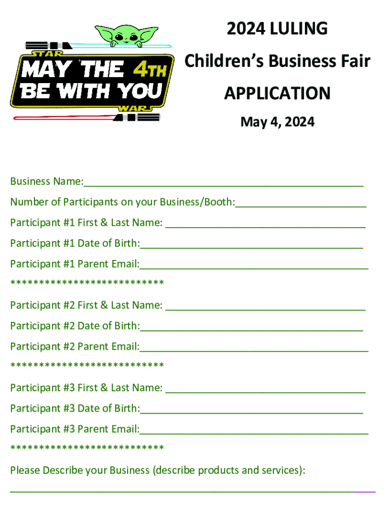 2024 LULING Childrens Business Fair APPLICATION May 4, 2024Business Name:___ Number of Participants on your Business/Booth:___ Participant #1 First & Last Name: ___ Participant #1 Date of Birth:___