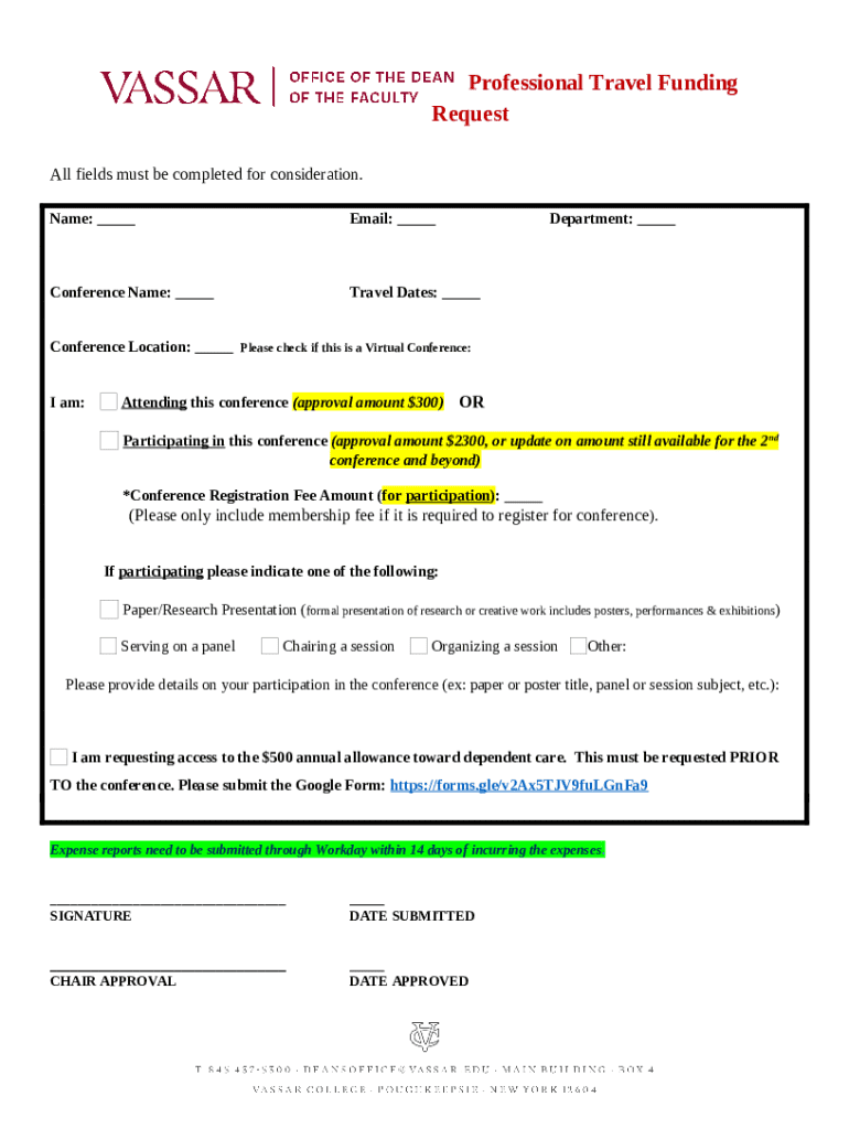 The What should I focus on when asking for conference travel ... is a document that has to be filled-out and signed for specific reasons. Then, it is provided to the relevant addressee to provide specific info and data. The completion and signing may be done in hard copy or via a suitable service e. g. PDFfiller. Such applications help to submit any PDF or Word file without printing out. It also lets you edit its appearance according to the needs you have and put a valid electronic signature. Once finished, the user ought to send the What should I focus on when asking for conference travel ... to the respective recipient or several of them by email and also fax. PDFfiller has a feature and options that make your blank printable. It offers various settings when printing out appearance. It doesn't matter how you file a form - physically or electronically - it will always look well-designed and firm. In order not to create a new writable document from the beginning every time, turn the original document as a template. Later, you will have a customizable sample.