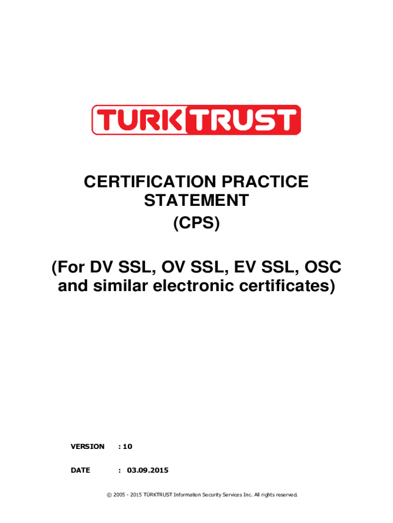 CERTIFICATION PRACTICE STATEMENT (CPS) (For DV SSL, OV SSL, EV SSL, OSC and similar electronic certificates)VERSION: 10DATE: 03.09.2015 2005 2015 TRKTRUST Information Security Services Inc. All rights reserved.CERTIFICATION PRACTICE STATEMENT Version 10 03.09.20151. INTRODUCTION .............................................................................................. 101.1.Overview .................................................................................
