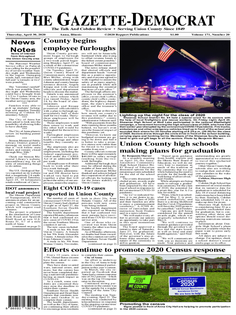 THE GAZETTEDEMOCRAT The Talk And Cobden Review Serving Union County Since 1849Thursday, April 30, 2020Anna, Illinois2020 Reppert Publications$1.00News County begins Notes employee furloughsItems of interest from throughout the Union County areaThe National Weather Service office in Paducah was calling for the possibility of severe weather Tuesday night and Wednesday in the region. Damaging winds, hail, torrential rainfall and a tornado or two were possible. *** The torrential