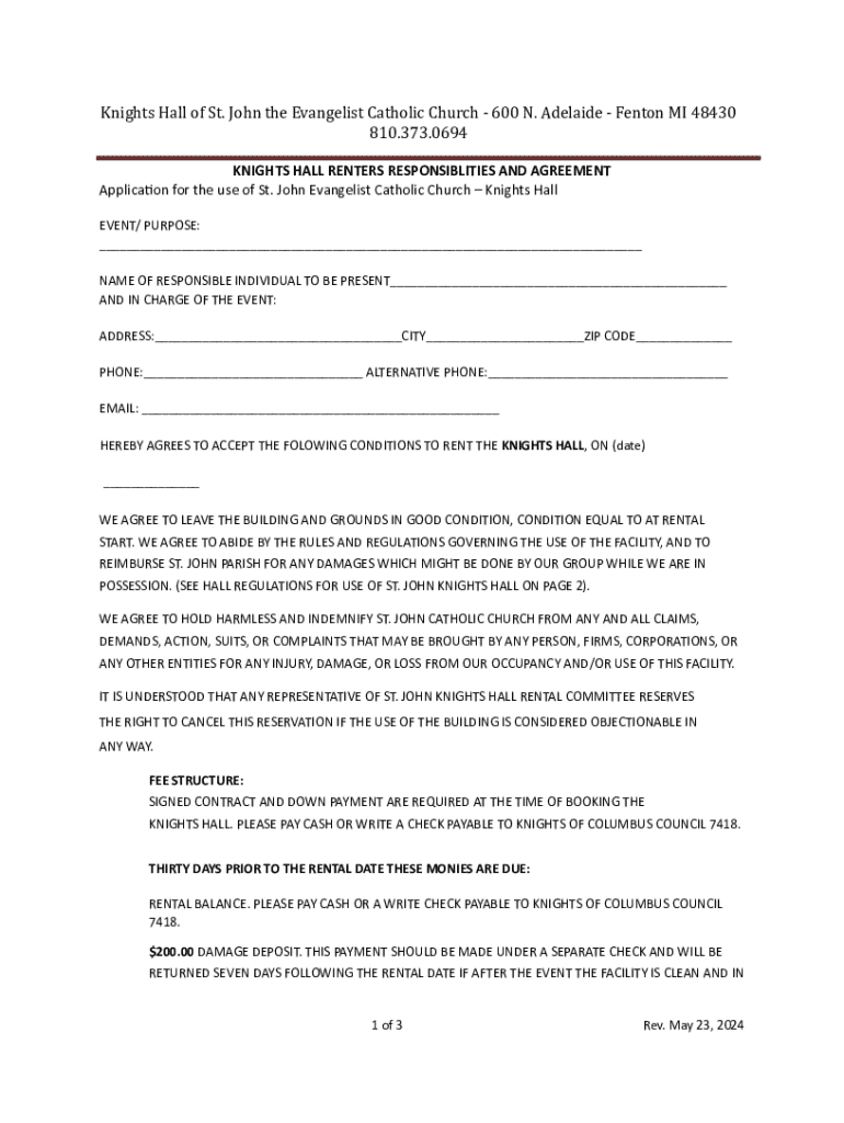 Knights Hall of St. John the Evangelist Catholic Church 600 N. Adelaide Fenton MI 48430 810.373.0694 KNIGHTS HALL RENTERS RESPONSIBLITIES AND AGREEMENT Applica on for the use of St. John Evangelist