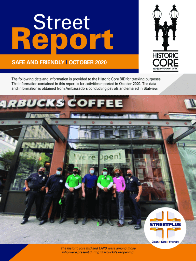 This report highlights key incidents and community efforts in the Historic Core BID for October 2020, focusing on safety, public service, and outreach activities.