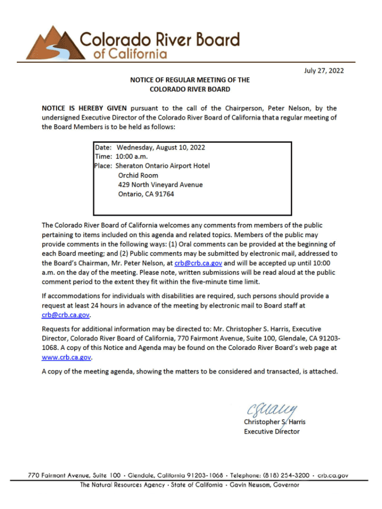 Regular Meeting COLORADO RIVER BOARD OF CALIFORNIA Wednesday, August 10, 2022 10:00 a.m. At the discretion of the Board, all items appearing on this agenda, whether or not expressly listed for action,