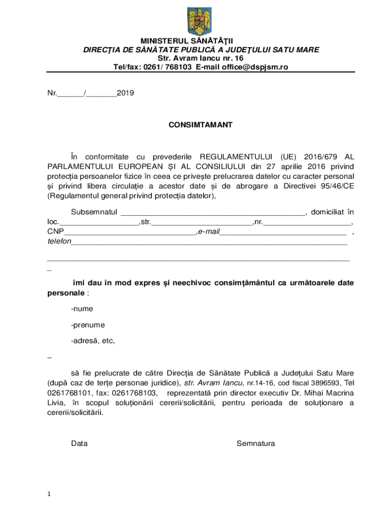 Tel/fax: 0261/ 768103 Email office@dspjsm.roNr.___/___2019CONSIMTAMANTn conformity cu prevederile REGULAMENTULUI