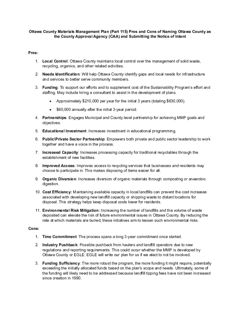 Ottawa County Materials Management Plan (Part 115) Pros and Cons of Naming Ottawa County as the County Approval Agency (CAA) and Submitting the Notice of IntentPros: 1. Local Control: Ottawa County