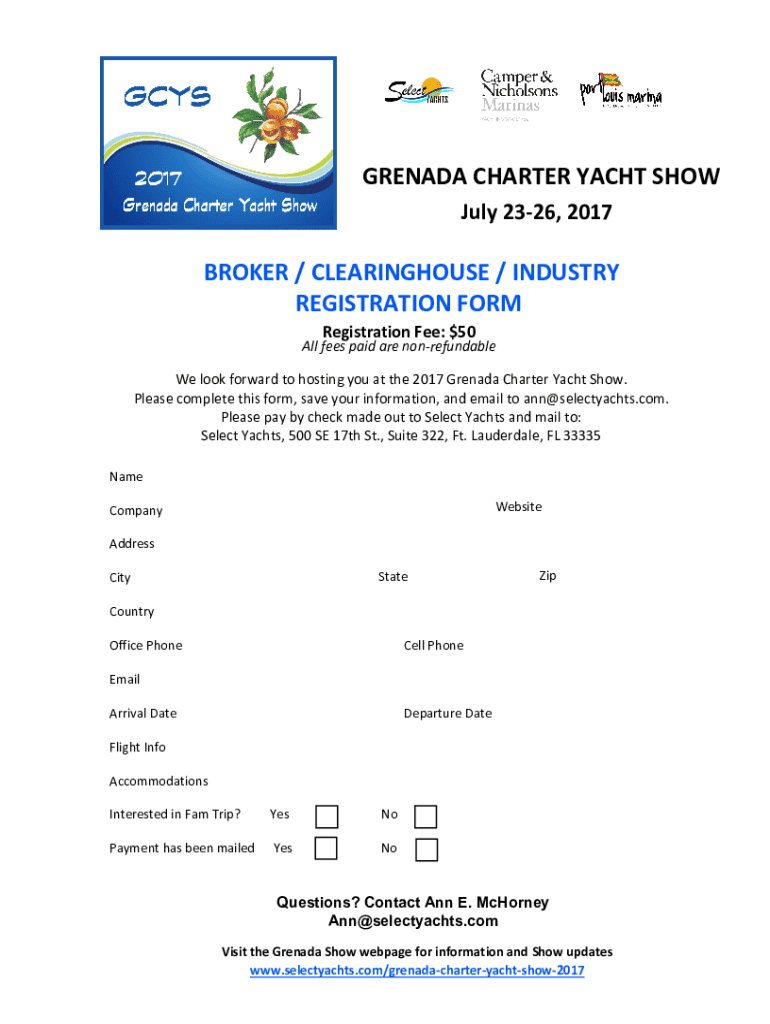 Register for the 2017 Grenada Charter Yacht Show. Complete the registration form and join us from July 23-26. Non-refundable fee of $50.
