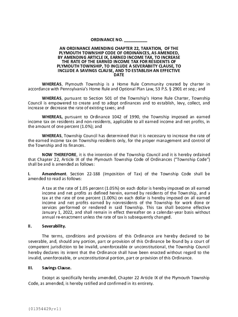 ORDINANCE NO. ___ AN ORDINANCE AMENDING CHAPTER 22, TAXATION, OF THE PLYMOUTH TOWNSHIP CODE OF ORDINANCES, AS AMENDED, BY AMENDING ARTICLE IX, EARNED INCOME TAX, TO INCREASE THE RATE OF THE EARNED
